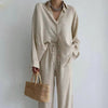 Step into the new season with effortless elegance in this trendy two-piece set. Combining a loose, long-sleeved blouse with straight-leg pants, it offers a refined yet relaxed look suitable for both office wear and casual outings.